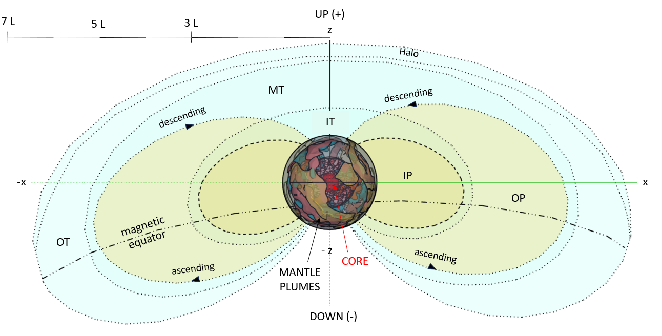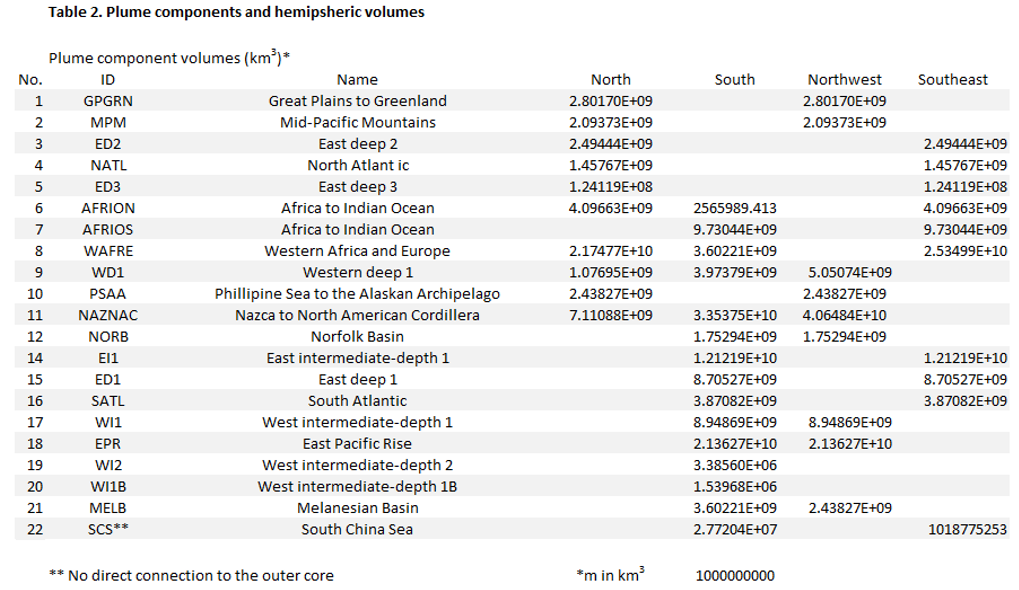 The toroid dipole moment of the total field is probably generated by the alignment of electron spin within circulating, ferrous fluids in Earth's outer-core shell. According to de Wijs and others (1998), fluids move under the Coriolis effect resulting in spinning, inner and outer cylindrical columns with radii comparable to the inner core (fig. 10). The outer-core columns are thought to occur in a hexagonal, closely-packed (h.c.p.) crystal form with adjacent columns spinning in opposing directions outward from the equator. The intersection of the outside columns form tear-drop-shaped surface gyres at the mantle base where two core-anchor structures in opposing hemispheres form the roots of overlying mantle plumes that are electromagnetically wired into the outer core (fig. 10) .