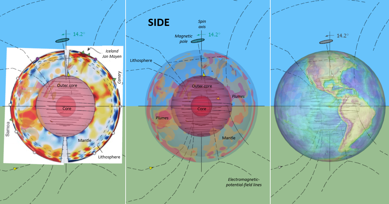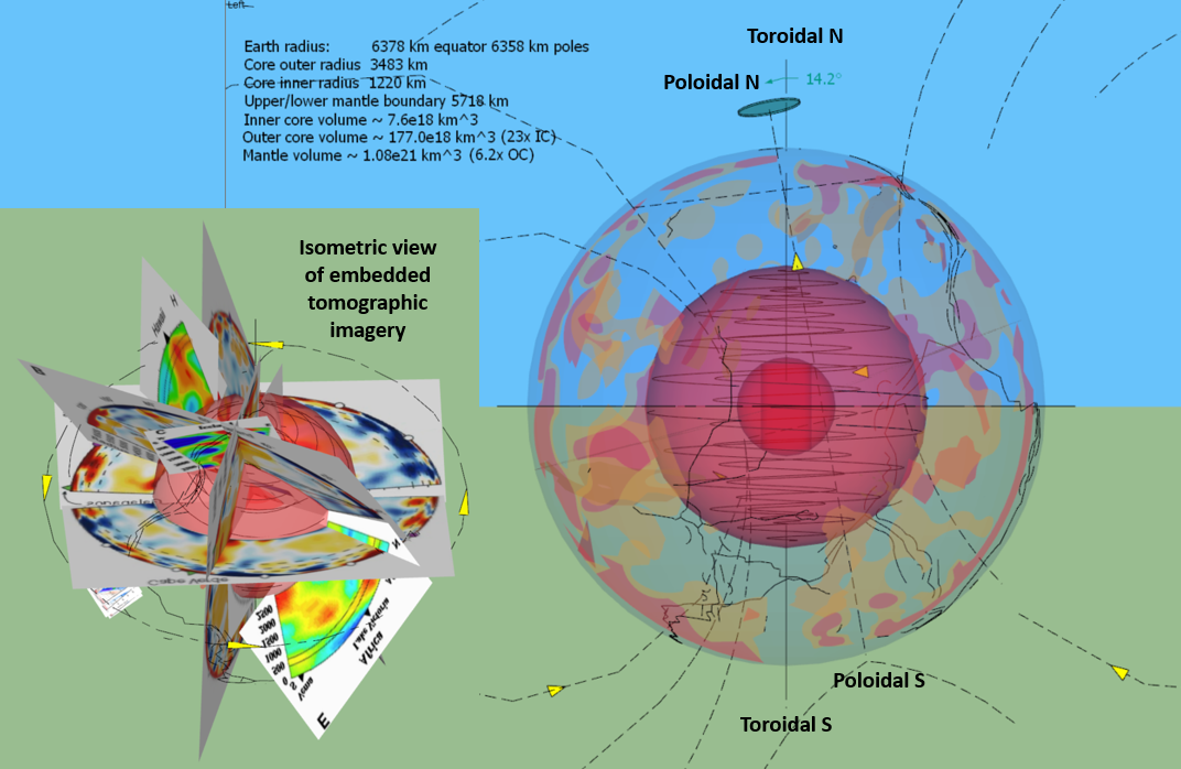 The model at this stage is incomplete and lacks many mantle details. I'm sure that there are other tomographic studies to compliment those used here that I haven't yet seen yet. Nevertheless, the embedded tomography provides a representative glimpse of the structural arrangement of the geodynamo components that constitute Earth's electrical armature. At least three distinct phase components operate including 1) the inner, solid spheroid, 2) the surrounding molten, fluid outer core, and 3) the thick, plastic heterogeneous mantle with structural heterogeneity stemming from a lifetime of bombardment, accretion, and tectonic movements. The model depicts these three different electromotive components: