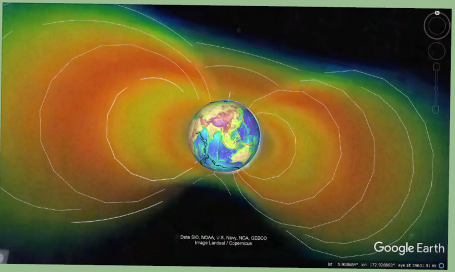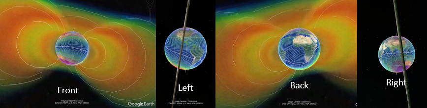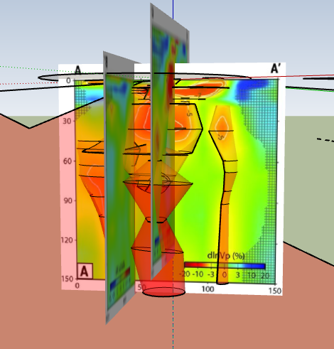 I first started modeling mantle structures using a when participating in an on-line Geological Society of America community-forum post about the structure of the Yellowstone caldera. For that, I began modeling the 3D plumbing system of Earth's mantle focused on Yellowstone's hot spot. Soon after I began adding other regional seismic-wave tomographic-study results from around the globe as 2D-profile images into a new, global model. At this time, sixteen different images are scanned and embedded in the model including some from Nolet and others (2007), French and Romanowicz (2014), Portner and others (2017), and Yuan and Romanowicz (2017). Each image was screen captured and saved as a colored-image file (*.PNG), then manually geo-registered into the SketchUp model as shown in figures 2 and 4 for various views. Some of the tomographic studies are are focused on areas of active mid-ocean spreading or subduction, but others cover hemispheric swaths of our planet and provide detailed coverage that is suitable as a basis for the geometric modeling depicted here (fig. 4). The model also includes an embedded, color-enhanced image of Earth's extraterrestrial, poloidal magnetic field stemming from the Unities States of America (USA) National Space and Aeronautic Administration (NASA) that has an image date of December 2003 (figs. 6 to 8).