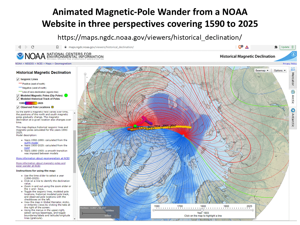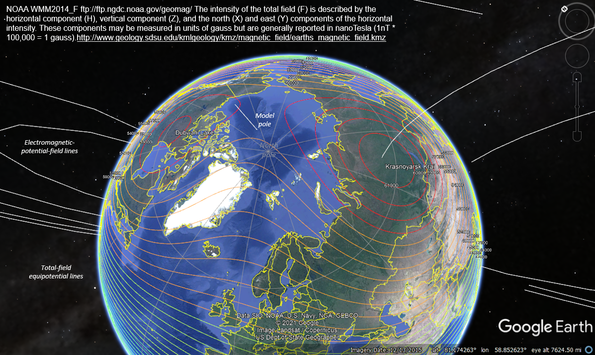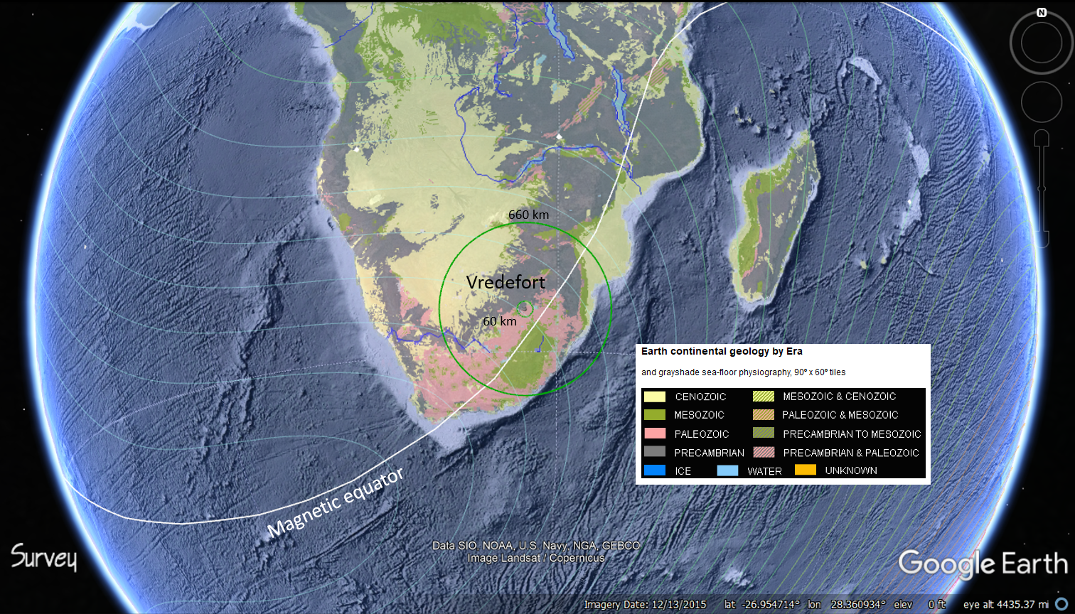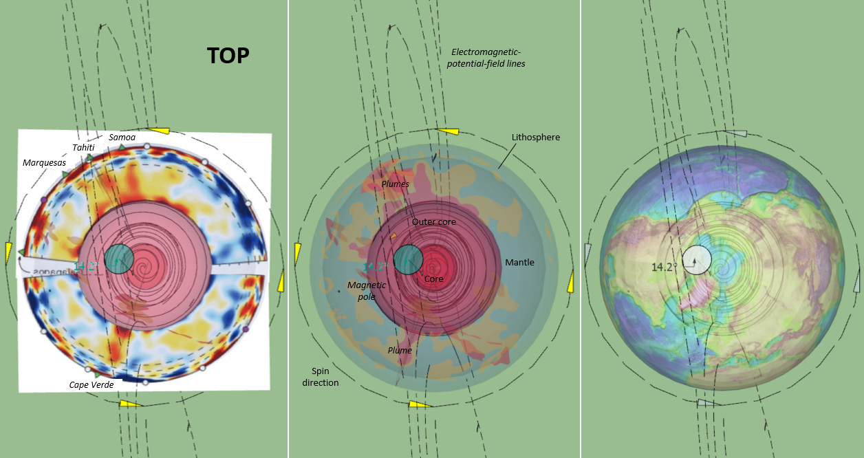 image to enlarge it Figure 2. Screen captures of the SUP model of Earth's structural layers and 16 embedded seismic-tomographic images portraying mantle structure. The total-field electrical components are shown to the right and include both a toroidal and poloidal dipole components that combine into Earth's total field. Figure 3. Details of the SUP model showing differentiated model components . The toroidal field is generate in the outer core with hydrodynamic stimulation from planetary spin. That dipole is fixed on the spin axis in agreement with computer model showing electromagnetic activity focused along the spin axis in the outer core. The poloidal field is more variable and in perpetual flux because its generated by a heterogeneous mantle subject to internal and external stimulation from both plate tectonics and impact tectogenesis. Figure 4. Top (above) and Side (below) views of an Earth SketchUp Pro model showing embedded seismic-wave (P- wave) tomography slices of the mantle (left). The model includes mantle plumes corresponding to the slowest-transmitting regions that are shaded red with surrounding slower ones shown in orange. The exact nature of the mantle heterogeneity is speculative, but the hottest and slowest-transmitting regions likely involving diffusion creep with localized magma generation and ascent. An array of plumes and colder, ferrous, mantle structures are electrically connected to the core where circulating Fe-rich magma surrounding a solid, ferrous core generate our electromagnetic field. Figure 5. The Vredefort crater and surrounding astrobleme is one of Earth's largest and oldest (2 billion year old) impact structures that likely imparted deep-seated mantle fractures and basic mantle melts that are part of Earth's electromagnetic dynamo as is appears to influence the location of our geomagnetic equator. Earth continental geology includes Cenozoic (yellow), Paleozoic (pink), Mesozoic (green). and Cenozoic (yellow) bedrock. Figure 7. The magnetic equator does not follow the geographic equator but dips and rises around the globe. They coincide most closely in the western Pacific and Indian Oceans. The extraterrestrial field is a 2D image aligned with the total-field intensity contours downloaded from San Diego State University in 2014. Click here for the Google Earth KMZ file shown above. Figure 8. A GE view of Antarctica and the south magnetic pole relative to the magnetic equator. Figure 9. Equipotential field lines (isopleths) on Earth's surface are total-magnetic field isopleths that are variously colored to emphasize the asymmetry of our electromagnetic-field with respect to Earth's spin axis. A SketchUp Pro was used to generate the 2D-polyline traces of our extraterrestrial, poloidal field component that is aligned with the surface-theme anomalies. Figure 10. A Microsoft Excel scatter plot of Earth's magnetic-polarity history of the past 120 Ma including a temporal plot of the diameter of 42 known and 8 suspected impact craters probably represent a small subset of the number of actual impacts awaiting discovery. The magnetic record only covers that part of geological time represented by preserved oceanic crust. |