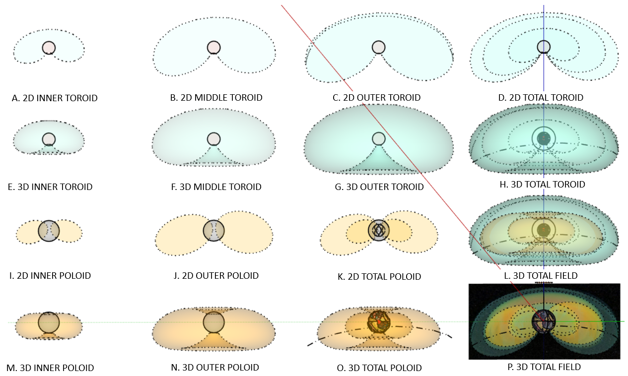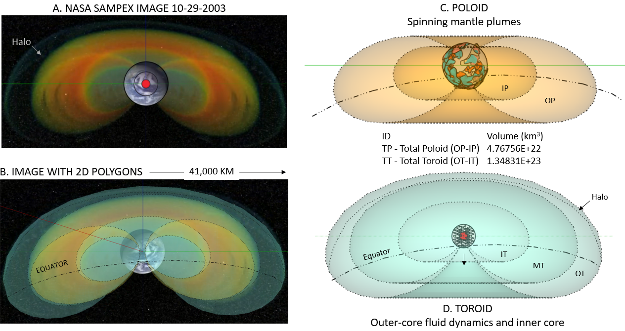 The U.S. National Space and Aeronautical Administration (NASA) releases short videos that characterize the geospatial and temporal nature of Earth's external radiation belts gained from their 2012-2020 SAMPEX mission (figs. 1 and 2). The inner radiation belt pulsates on a daily basis and they continuously fluctuate in extent depending upon the intensity of the solar winds and Earth's inductive response (fig. 2). A snapshot of the SAMPEX-sampled radiation belts from 09/07/2012 was used to quantify their 2D and 3D components based on their false-color representation that highlights regions in space surrounding Earth where various atomic particles in the Solar winds get trapped and temporarily held by the radiation belts. My interpretation of the SAMPEX data into the two, main, poloid and toroid dipole components is summarized in figures 4 to 9. As summarized in figure 6, the toroid moment envelopes the smaller poloid and is estimated to be about three times as large. Figures 8 and 9 show how the respective total-field components overlap.