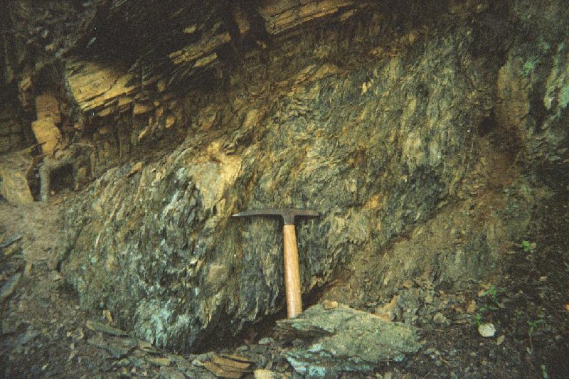 Stop 3 An outcrop of the Antes/Coburn detachment. A pre-folding, thin cleavage duplex in the Antes Shale at the top of the Ordovician carbonate section shows early fault transport and a marked strain discontinuity.