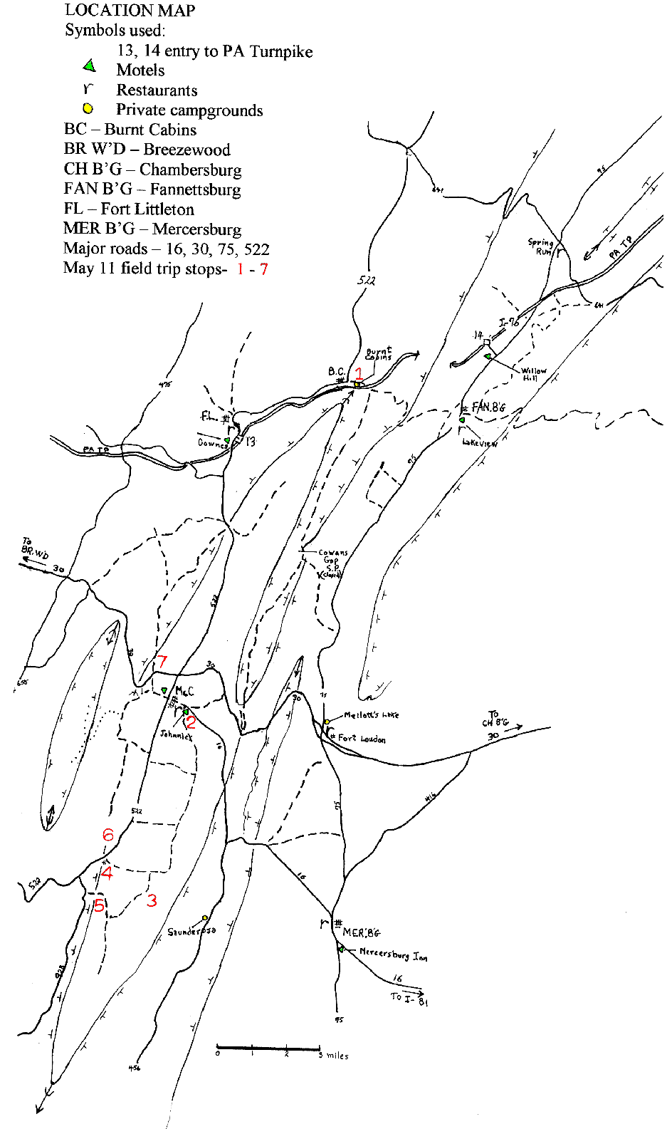 The 2002 ATSG field trip was held May 10 - 12 in south central Pennsylvania . Nick showed us evidence for Alleghanian sequential deformation expressed in the counter-clockwise rotation of layer-parallel shortening or vergence directions and coincident change in the nature of fault fabrics. Saturday May 11 was spent traversing the Big Cove anticline and Sunday May 12 was spent in the Path Valley. Seven of the stops are marked on the index map.
