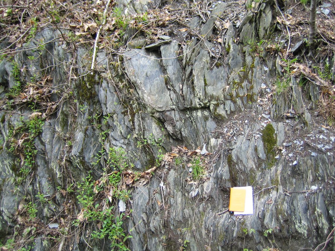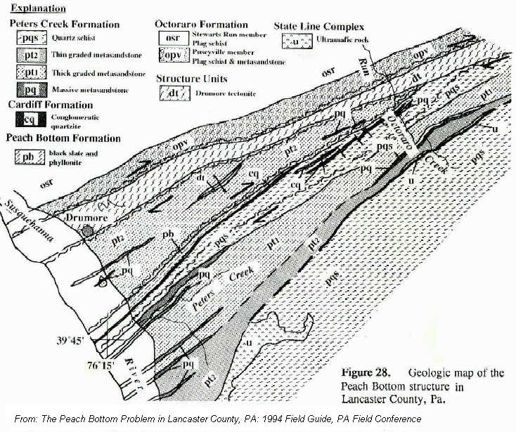 The first day of the field trip was spend examining outcrops of the Peters Creek and Octoraro Formations. We compared the lithologic, structural and metamorphic variations of the two Formations progressing from the NW to the SE along the Susquhanna River. We saw field evidence for dextral transpression in the western Piedmont. The second day was spent examining the Peach Bottom Slate. This is reportedly formed by dynamic retrograde metamorphism with enveloping phyllites and schists. The 30 km long slate belt is characterized by low-grade metamorphic mineral assemblages, intense deformation and attendant grain-size reduction, numerous micro-scale (100-200 µm) porphyroclasts with kinematic significance, and chemical homogeneity that occurs across the belt. Compared with enveloping phyllites and schists, the slate has a higher density and is chemically similar, yet displays some chemical traits imposed by retrograde metamorphism. The proposed origin accounts for the legendary properties of the Peach Bottom slate, the first commercial slate quarried in North America, including its unparalleled hardness, durability, and color retention after more than two centuries of use.